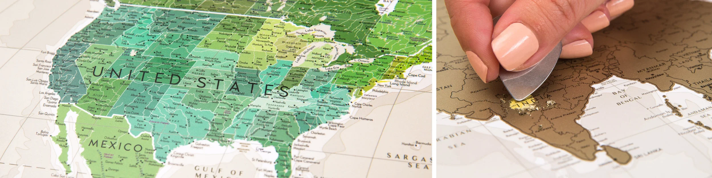 If you’re anything like me, you like to do a little bragging about all of the off the beaten path places you’ve visited. It’s one thing to show your friends and family photos of lush landscapes and sunswept beaches, but seeing those locations in comparison to where you live puts the vastness of your travels truly into perspective. If you’re looking for a personalized way to commemorate your adventures, there’s no better way than by hanging a push-pin or scratchable map on your wall.